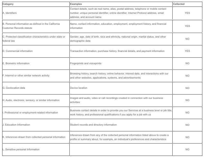 The table below shows the categories of personal information we have collected in the past twelve (12) months. The table includes illustrative examples of each category and does not reflect the personal information we collect from you. For a comprehensive inventory of all personal information we process, please refer to the section "WHAT INFORMATION DO WE COLLECT?"